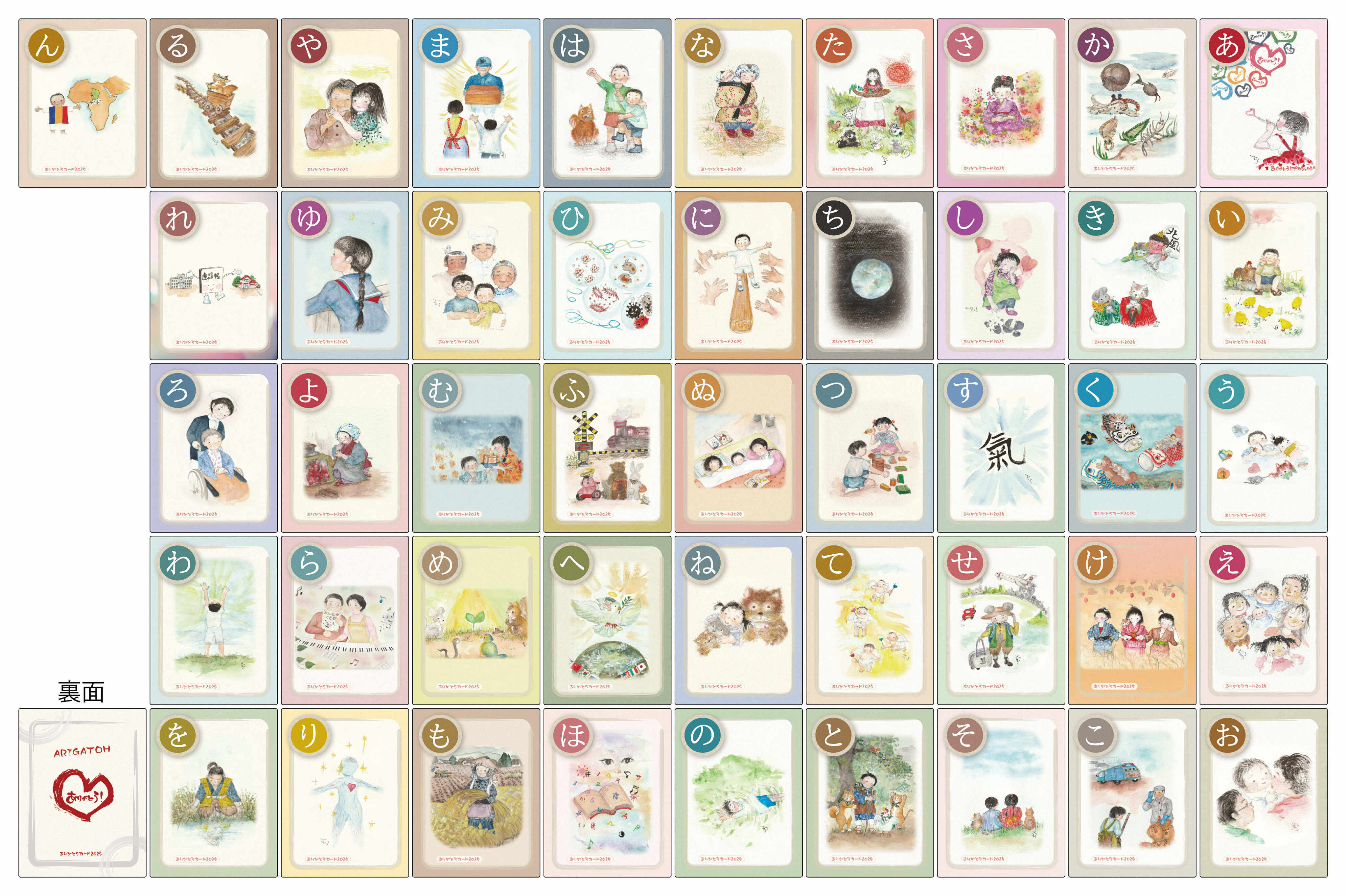 ・カードのサイズ:通常のカルタ サイズ。読み札 46枚、絵札 46枚、質問 札 8枚 合計100枚です。