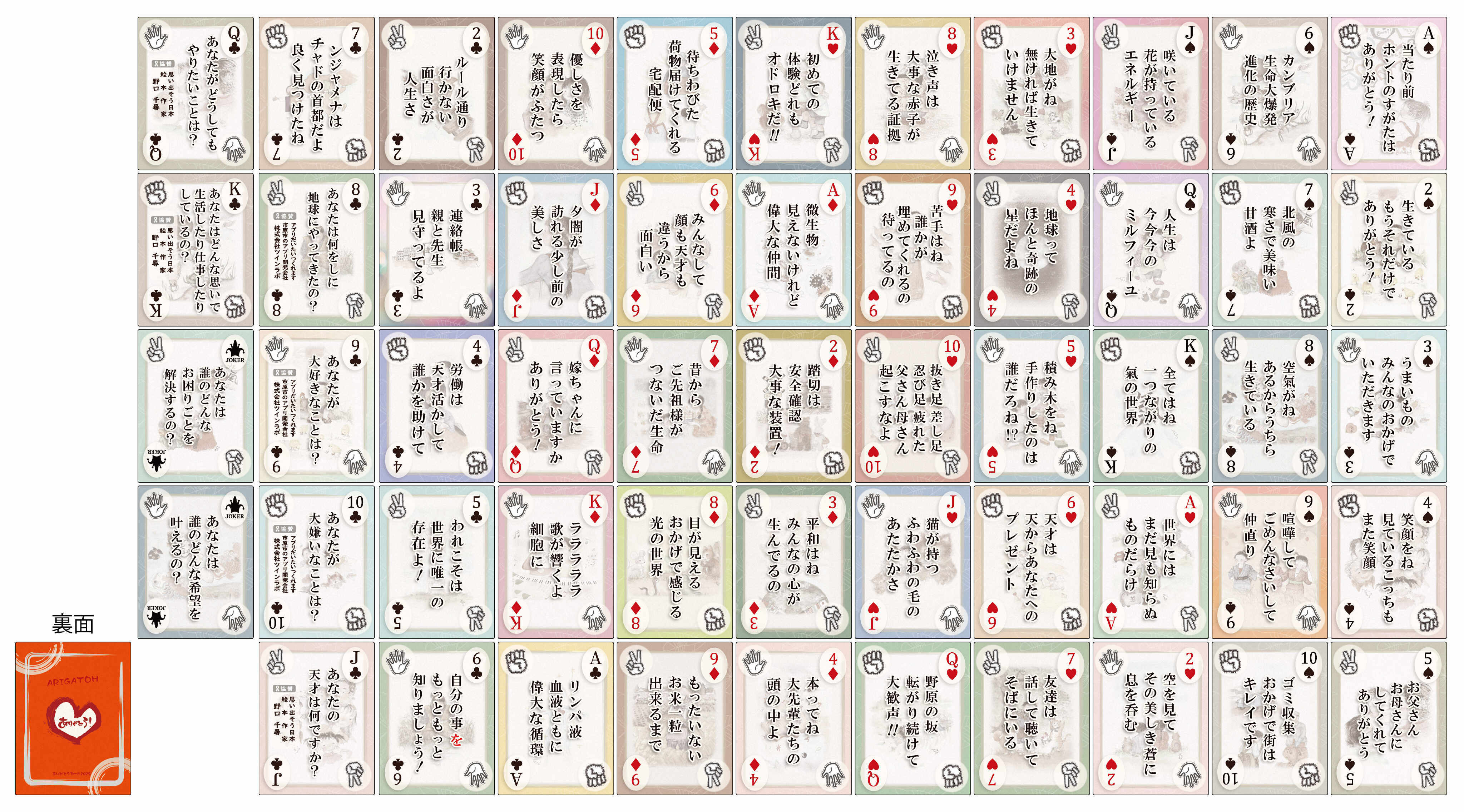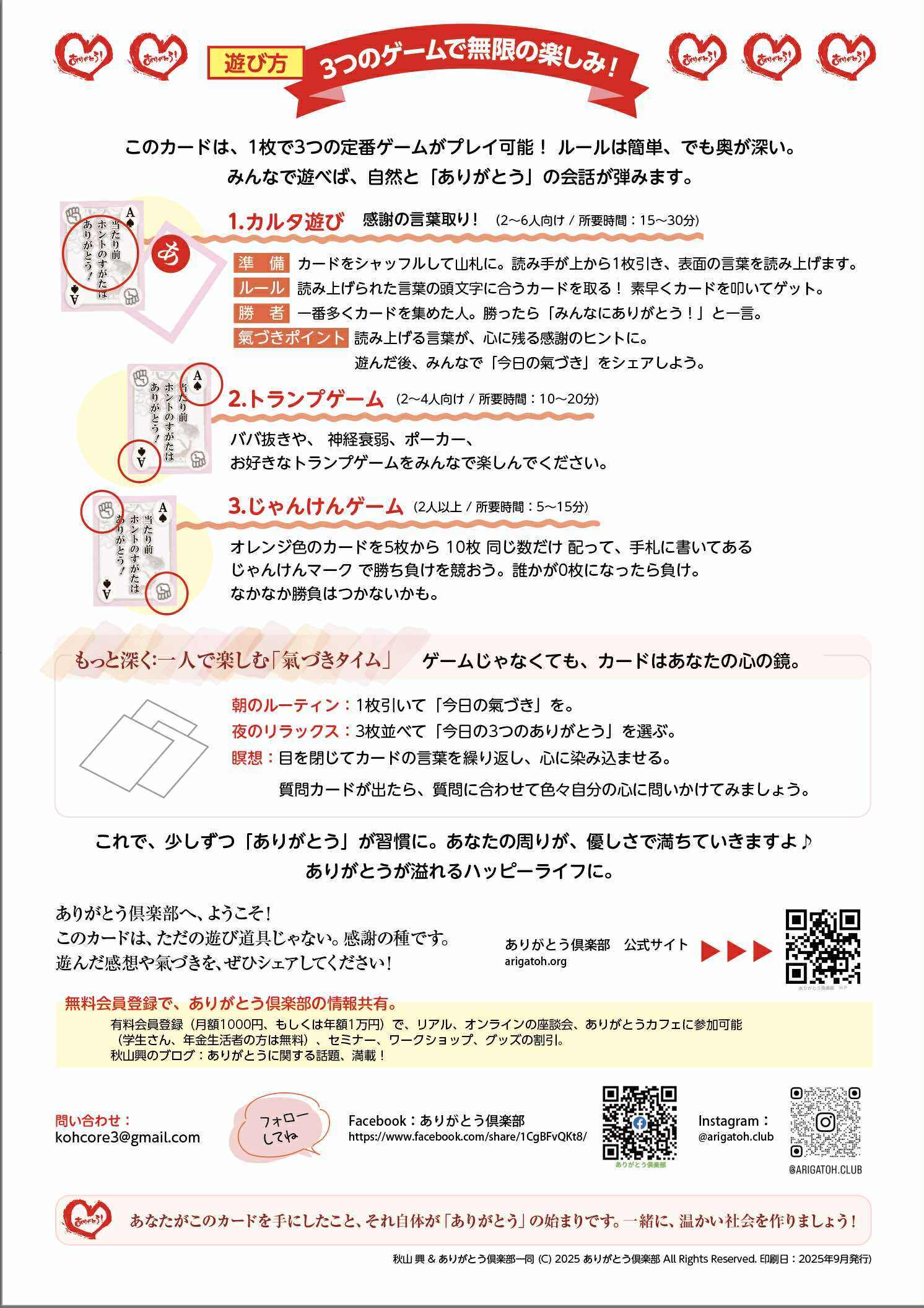 「ありがとうカード 2025」は、遊びが広がる魔法のカードです。これ一つでかるた、トランプ、ジャンケンゲームなど、さまざまな遊びが楽しめます。周りの人への感謝や、自分自身の素晴らしさに気付かせてくれるこのカードは、遊ぶことで心が軽くなり、自信を深めることができる特別なツールです。友達や家族と一緒に楽しみながら、毎日の感謝の気持ちを再確認してみてはいかがでしょうか。